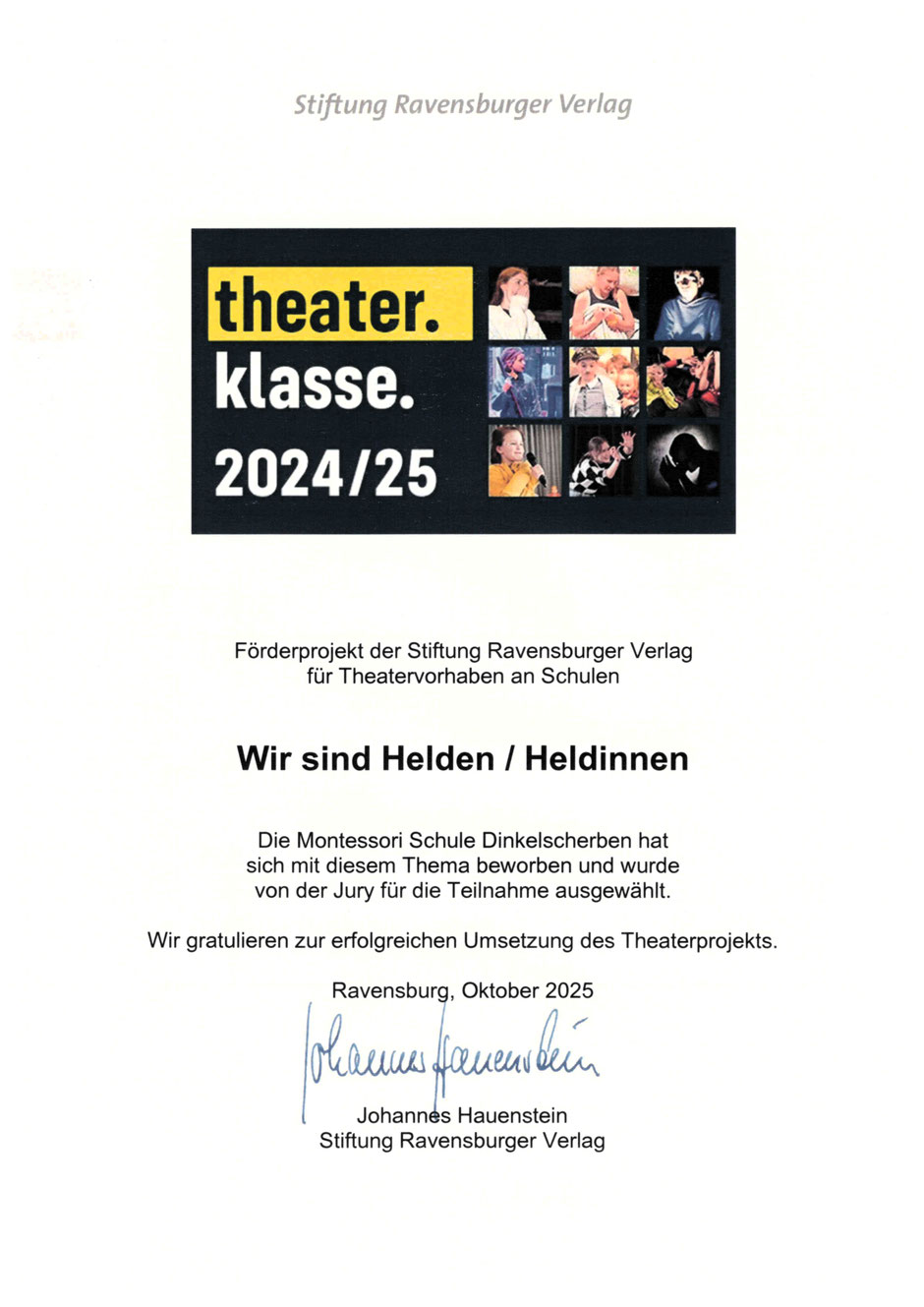 Unsere Montessori Schule wurde von der "Stiftung Ravensburger Verlag" für ihr kreatives Theatervorhaben ausgewählt. Unter dem Motto „Wir sind Helden / Heldinnen“ setzten sich die Schülerinnen und Schüler im Schuljahr 2024 / 2025 mit Mut, Stärke und Zusammenhalt auseinander – und brachten diese Themen auf die Bühne.